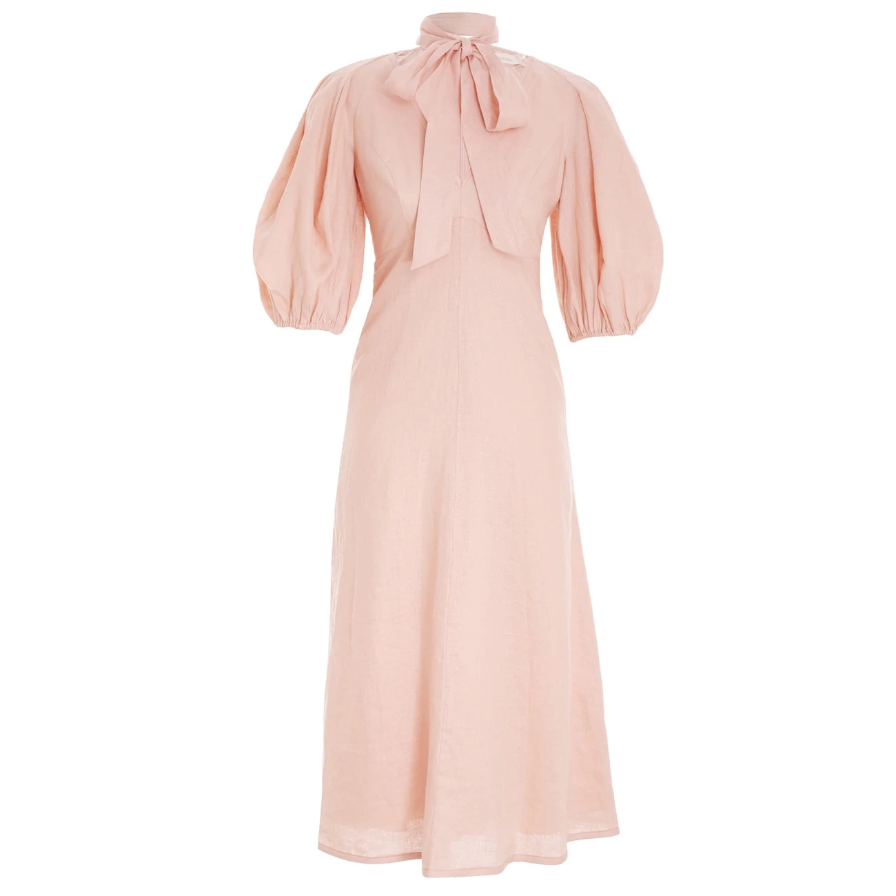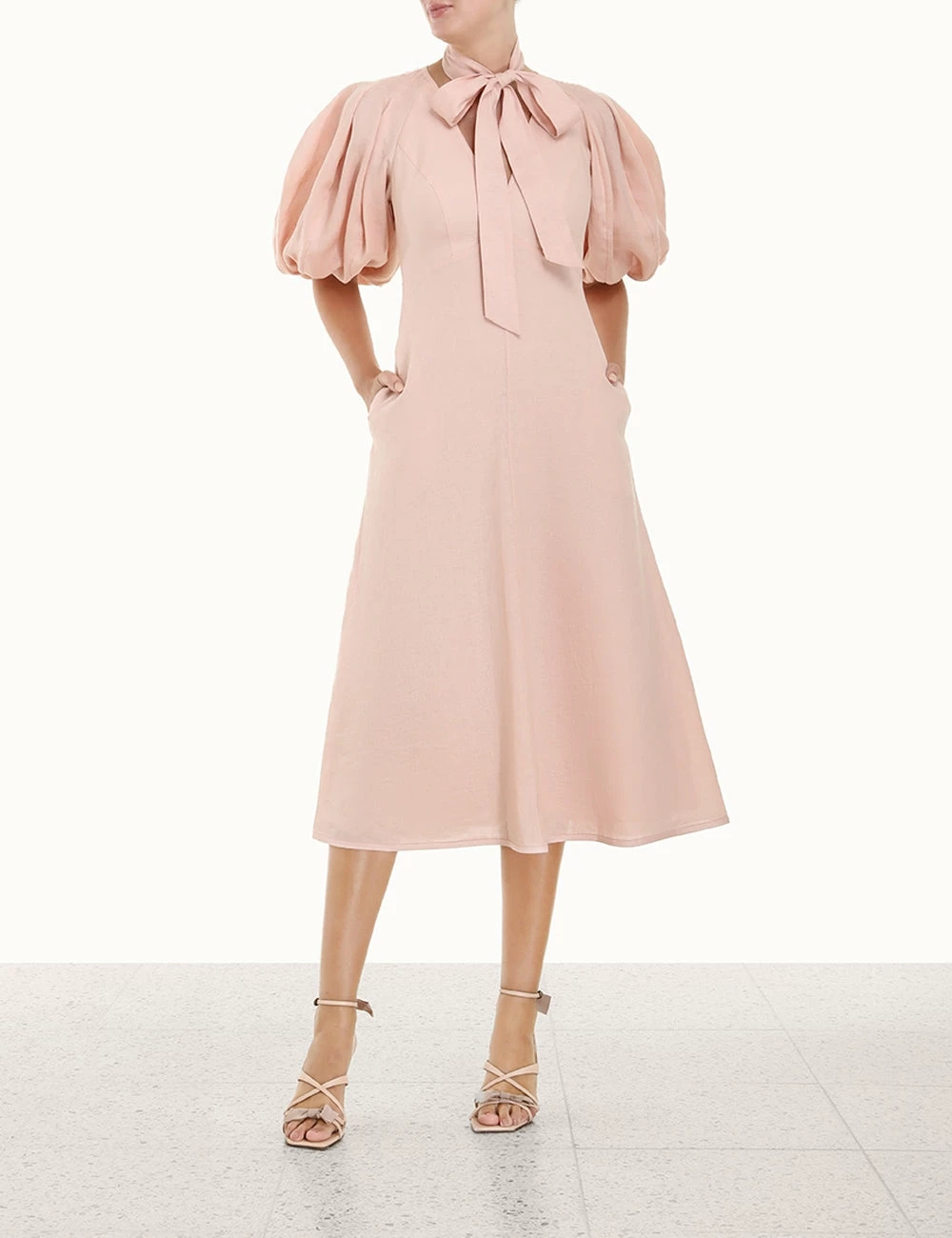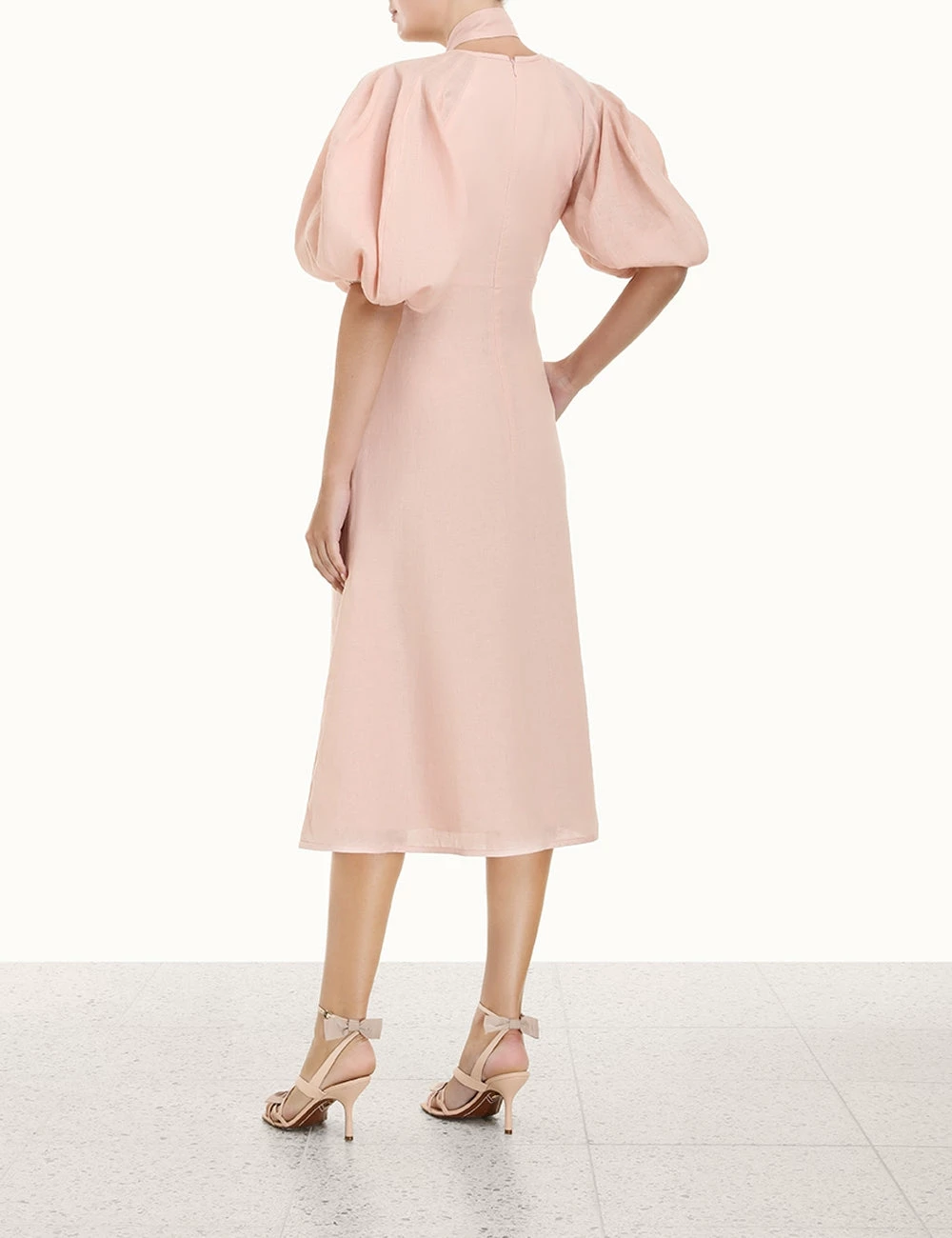 The Dancer Day Midi Dress in Blush is a linen midi dress featuring a V-neckline, short blouson sleeves with elasticated cuffs and a removable necktie.