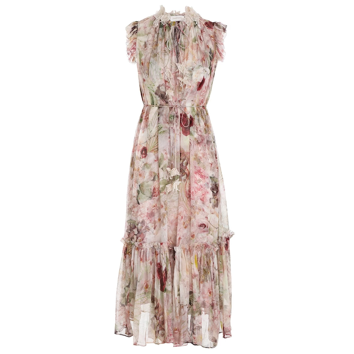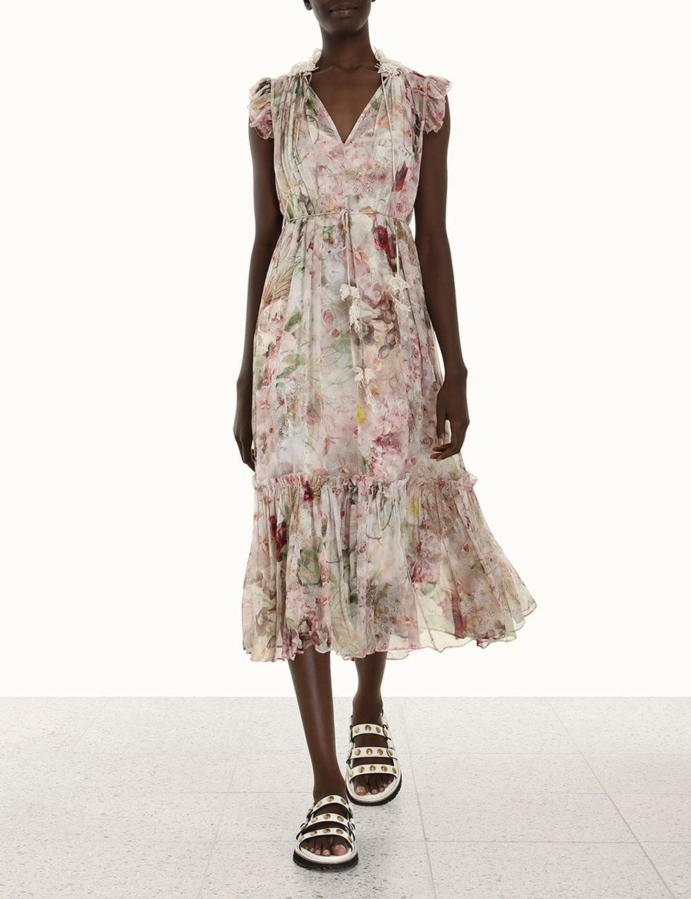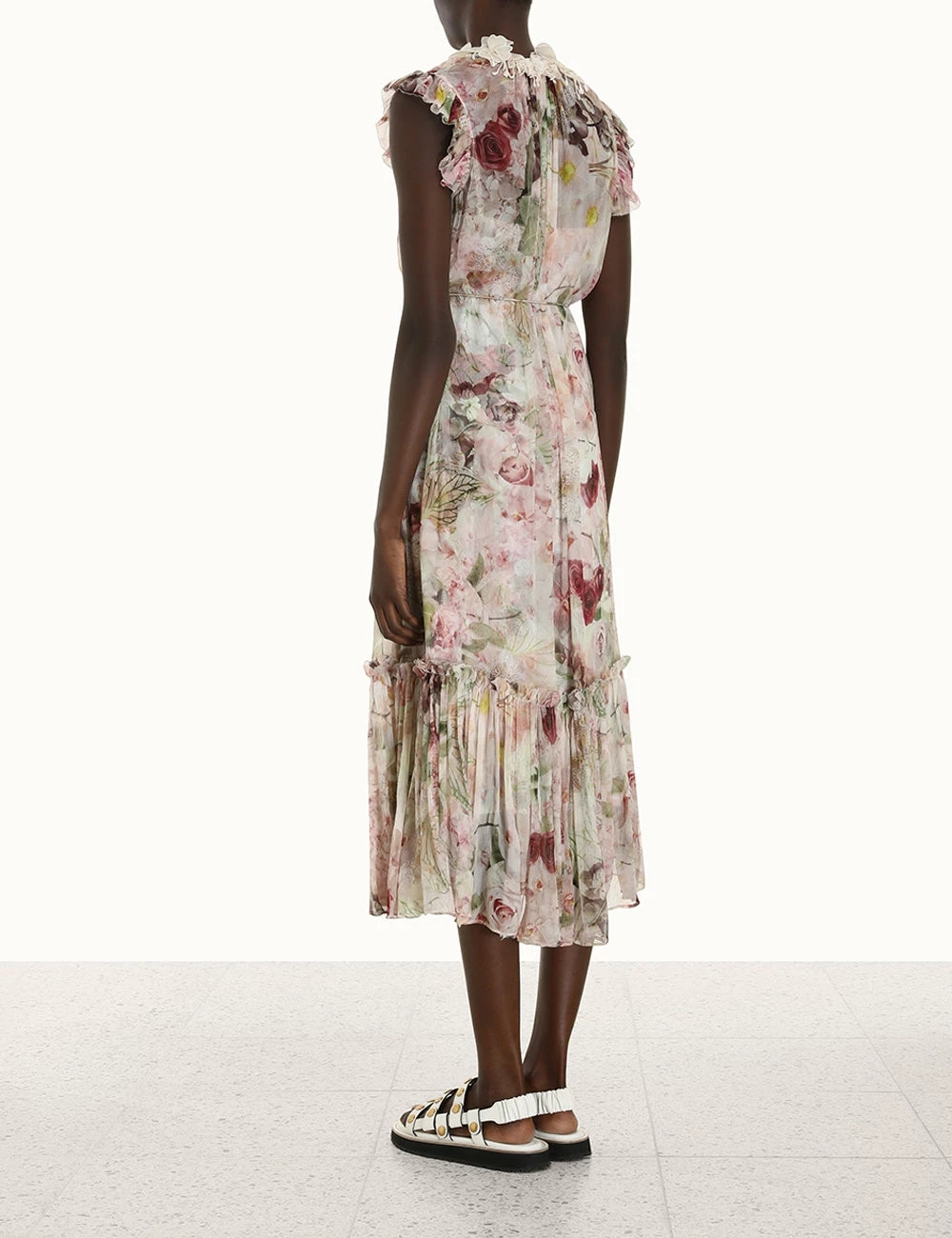 The Dancer Flutter Dress in Alabaster Garden Floral is a silk crinkle georgette midi dress featuring embroidered flower appliqués at the collar, flutter sleeves and drop hem and hand sewn 3D laser cut disc trims with gold beads at the self tie neck and waist.