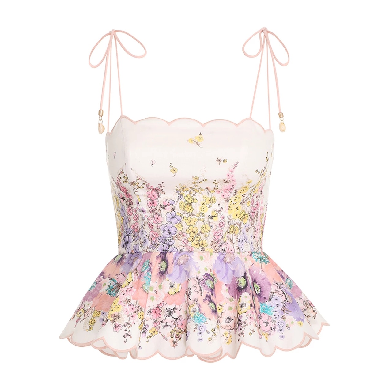 The Jude Scallop Top in Peach Gradient Floral is a linen top featuring a peplum hem, contrast self tie rouleau shoulder straps and embroidered scalloped edging throughout.