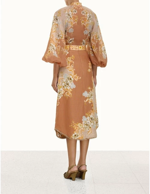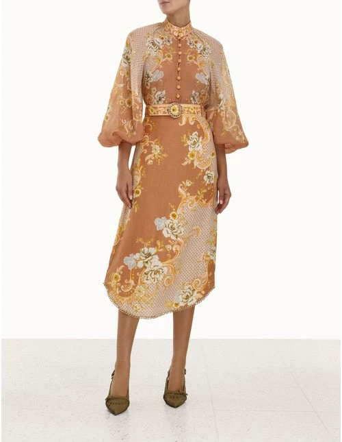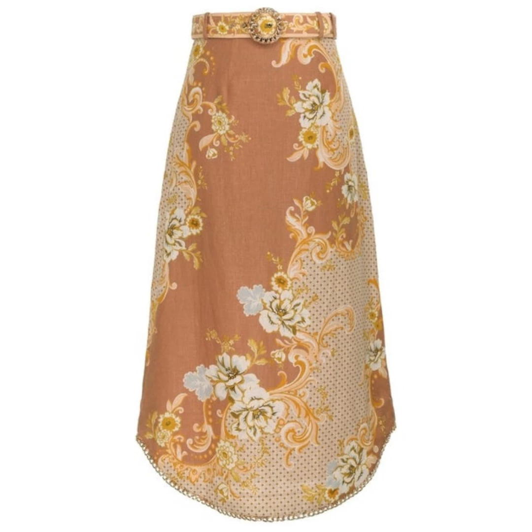 The Postcard A-Line Skirt in Swirl Floral Tan from Zimmermann’s Resort 2022 Collection, The Postcard. A linen A-line midi skirt featuring chain trims at the hem.