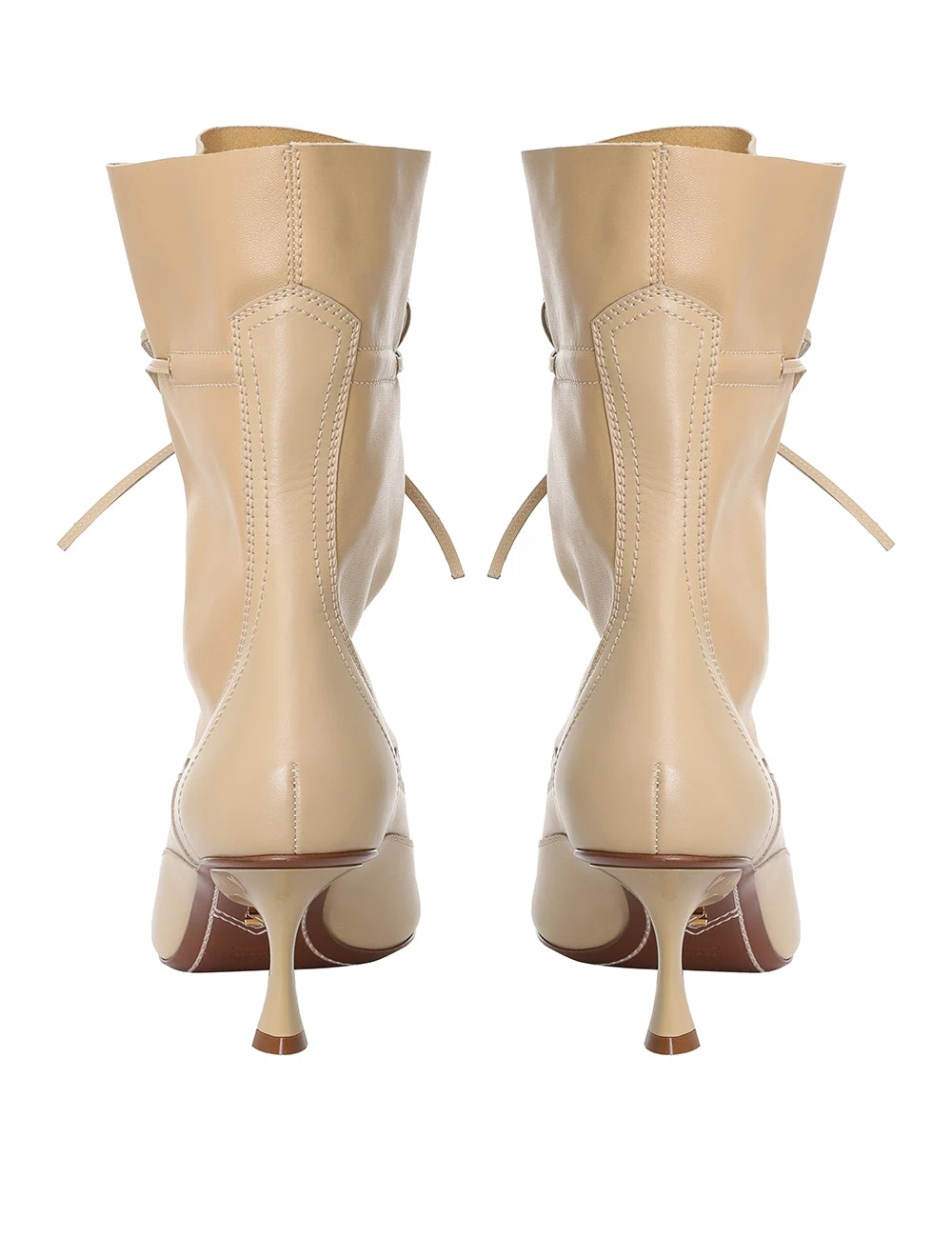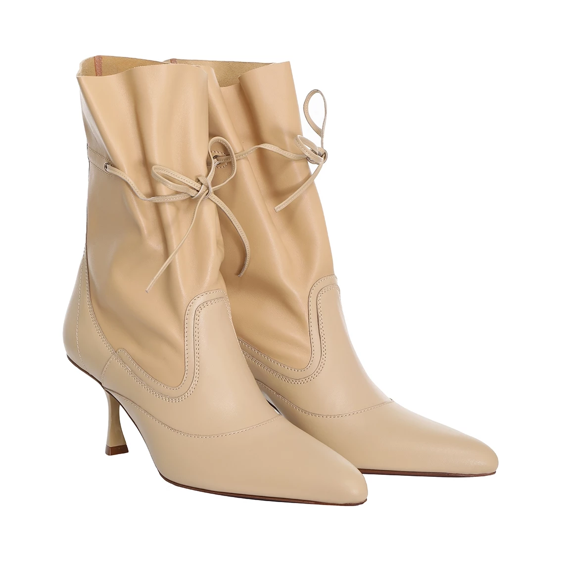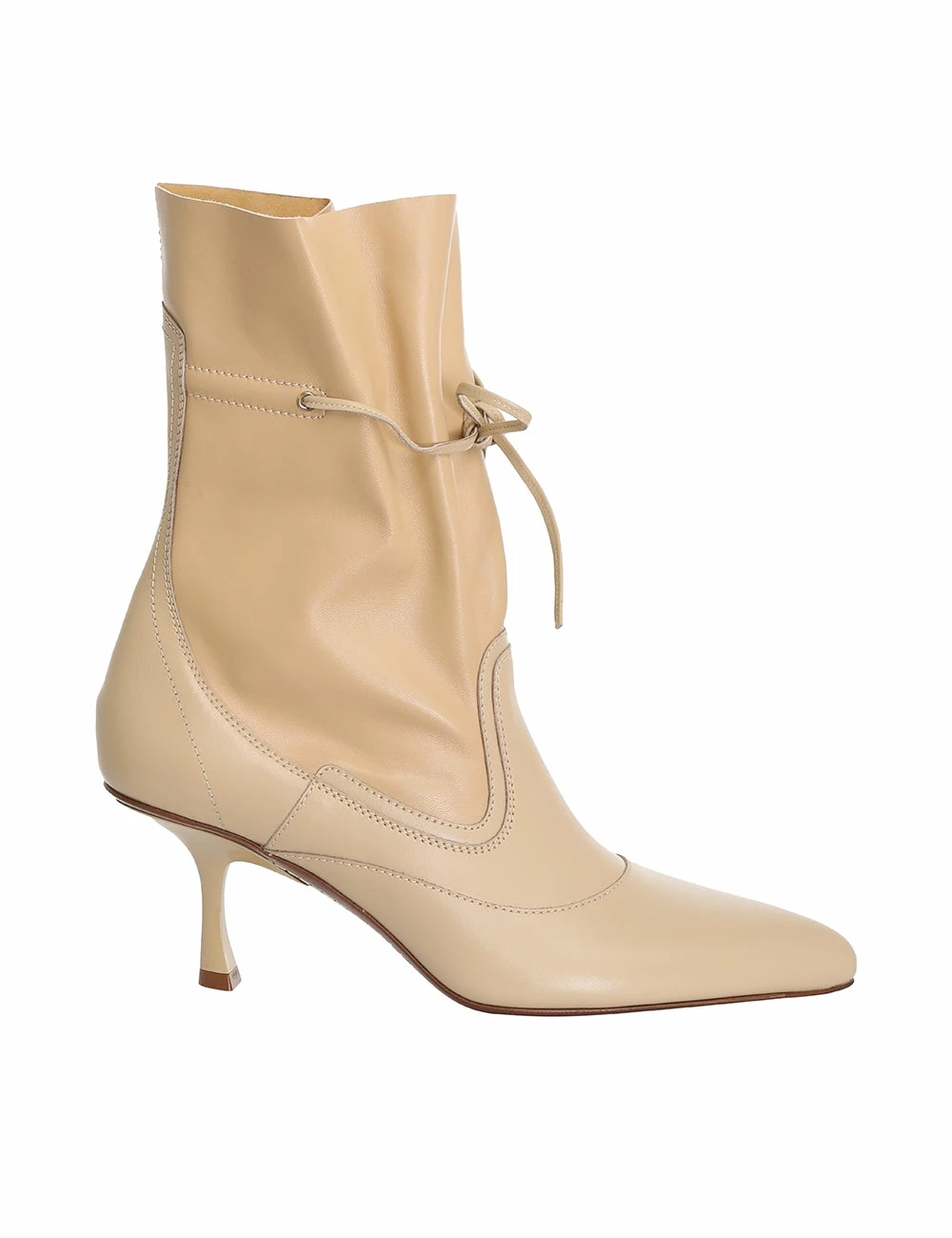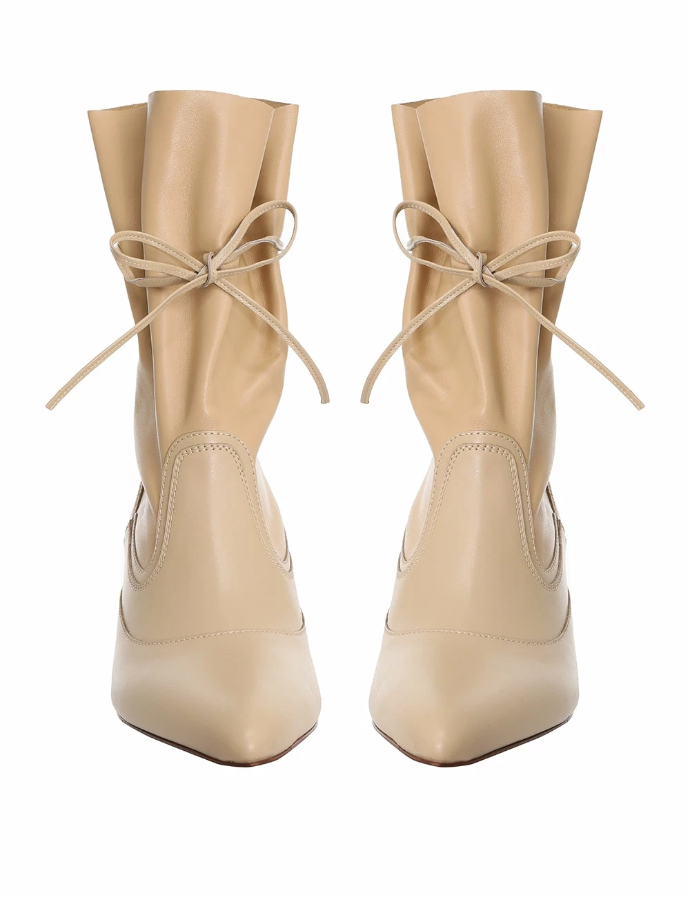 The Soft Gathered Tie Boot in Wheat is a heeled leather boot with an ankle wrap lace detail.