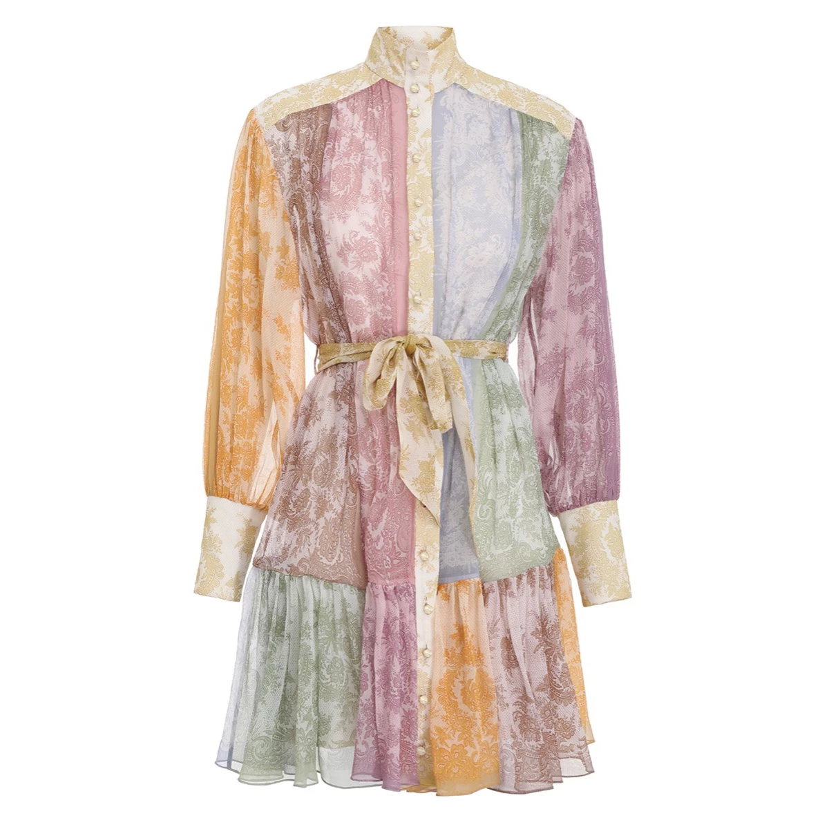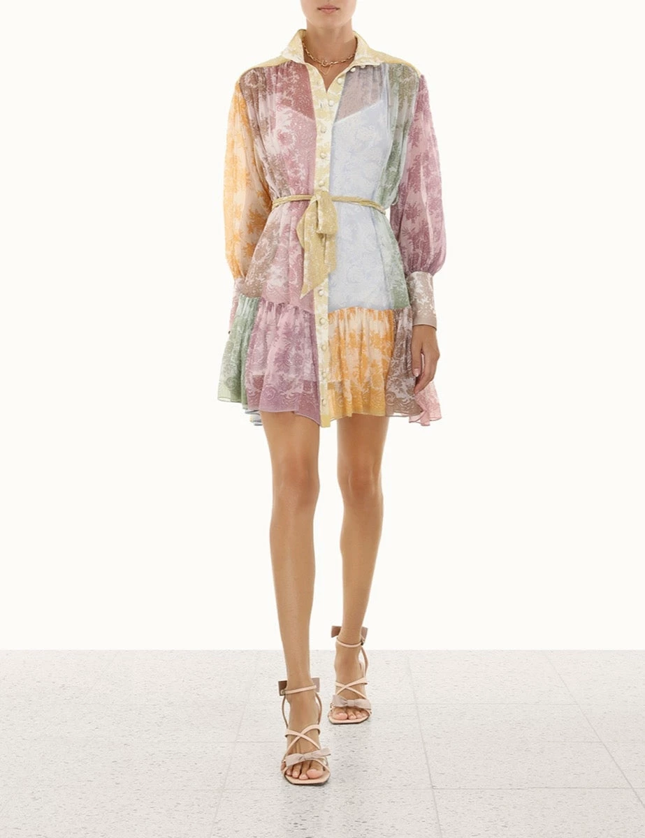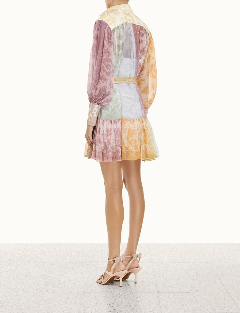 The Dancer Lantern Mini Dress in Spliced Lace Print is a spliced silk crinkle georgette mini dress featuring self cover buttons down centre front and blouson sleeves with elongated cuffs.